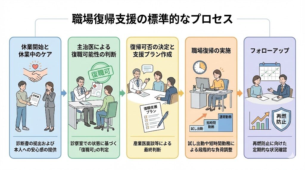 厚生労働省が策定した「職場における心の健康づくり」や「心の健康問題により休業した労働者の職場復帰支援の手引き」は、多くの企業が復職フローの基盤として採用しており、その全体像は以下のように整理されています。