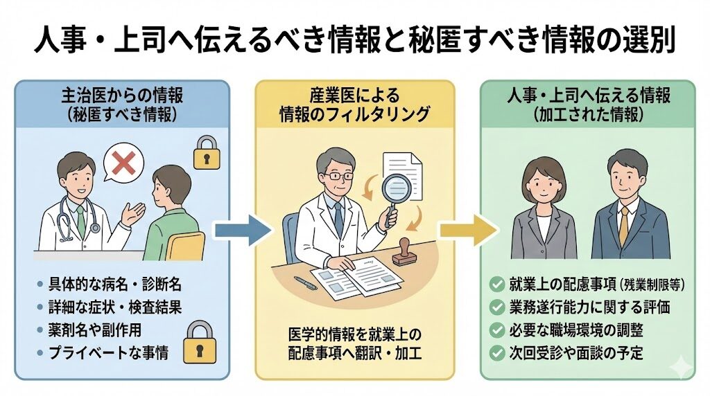 このように情報を適切に「フィルタリング」することで、プライバシーを保護しつつ会社の安全配慮義務を果たすことが可能になります。主治医と産業医がこの選別のルールを共通認識として持つことで、安心して情報を共有できる土壌が整います。🌱