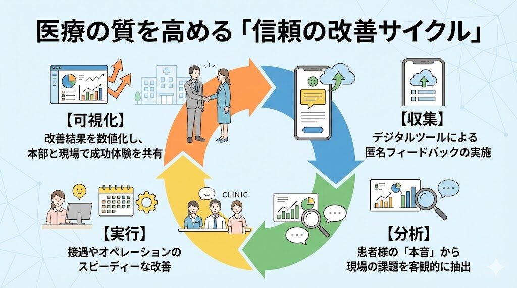 そして、この「信頼」が正しく形になっているかを客観的に確認するために、患者様の声を反映させる仕組みが必要となります。