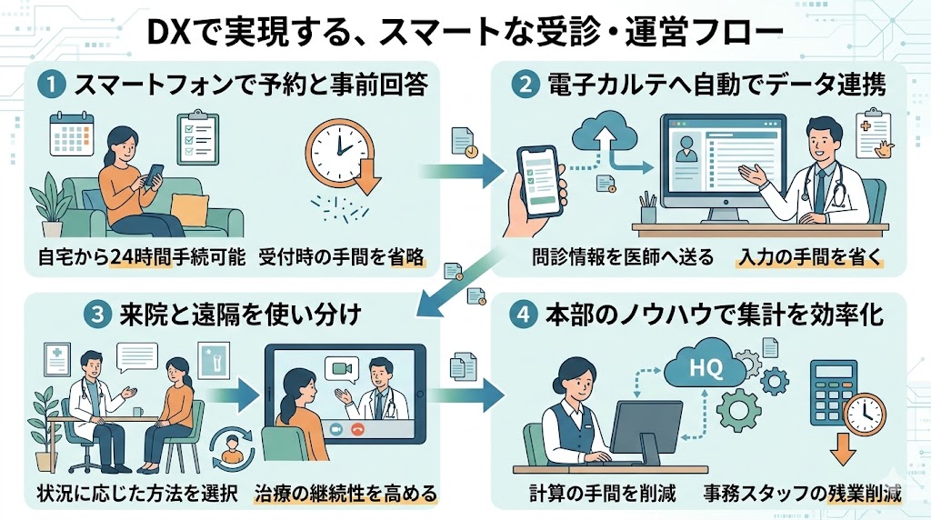 FC本部のIT基盤を活用すれば、自前でシステムを選定するリスクを避け、開業初日からスマートなクリニック運営が可能になります。具体的なフローは以下の通りです。