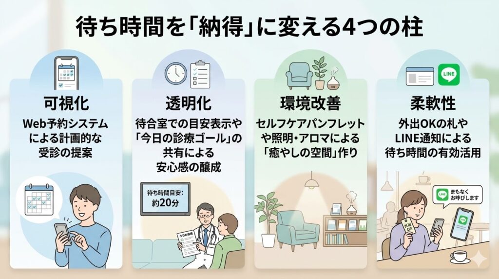 第1章で触れた「待機時間の摩擦」を解消するためには、単に時間を短縮する努力だけでなく、待っている間の「心理的負荷」をいかに軽減するかが重要です。待ち時間を放置された苦痛な時間から、治療への納得感を高める時間へと変えるための「4つの柱」をご紹介します。
