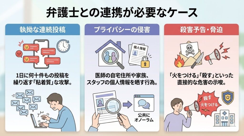 他の患者様の安心やスタッフの平穏を著しく脅かす行為は、もはや医療の枠組みを超えた「社会的トラブル」です。 特に以下の図に該当するような事態では、クリニックの存続や安全に関わるため、専門家を交えた毅然とした対応が求められます。
