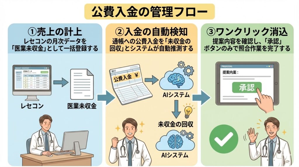 | 公費入金の管理 | 通帳と集計表を目視で一行ずつ照合 | 自動提案によるワンクリック消込 |