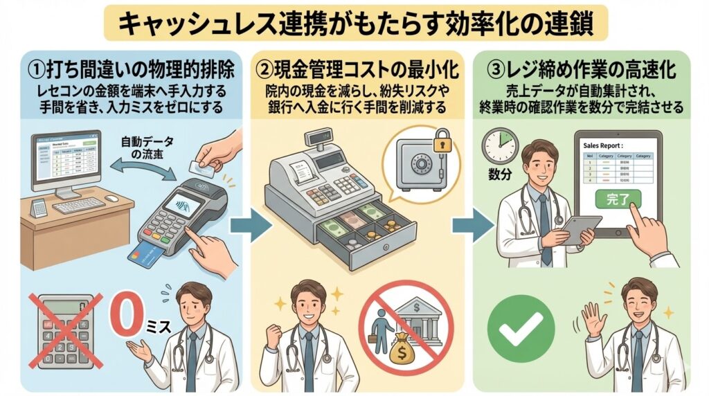 図が示す通り、決済端末と会計ソフトが連動することで、窓口の作業は「手作業」から「自動データ流転」へと劇的に変化します。この一連のフローは、人為的なミスを源泉から断ち切るだけでなく、物理的な現金を扱う重圧からもスタッフを解放してくれます。