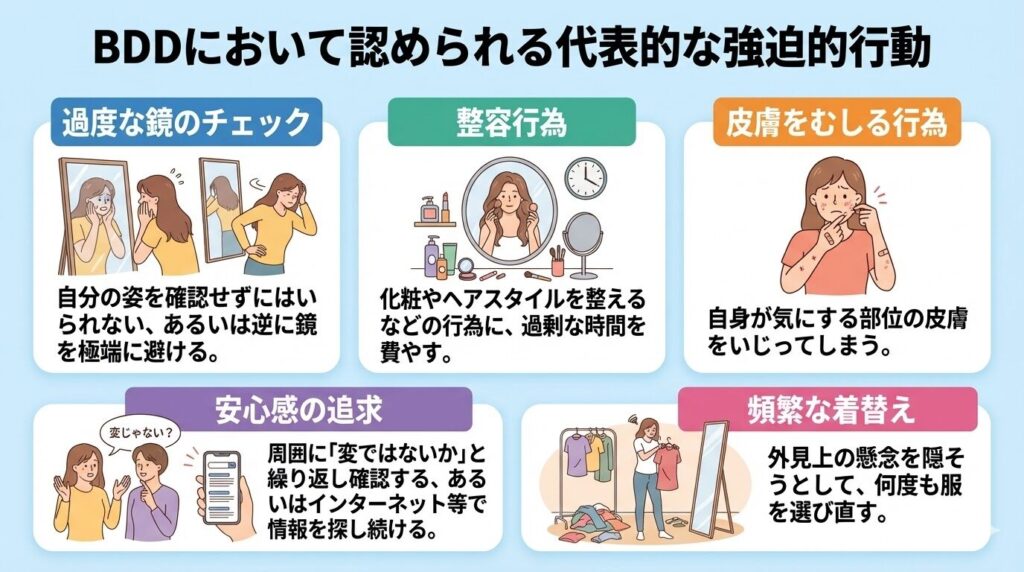 こうした外見への没頭は、しばしば不安を解消しようとする強迫的な行動(compulsive behaviors)を伴います。論文では、代表的な行動として以下の5つを挙げています。💡
