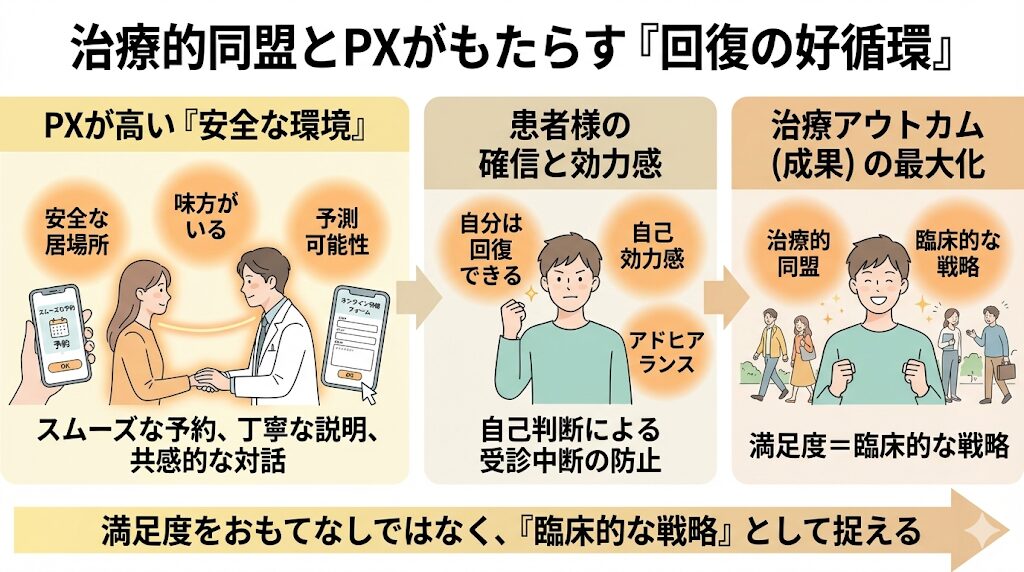 PXを高める取り組みは、単なるサービス向上ではありません。それは、医師と患者様が共通の目標に向かって歩むパートナーシップ、すなわち医学的に極めて重要な「治療的同盟(セラピューティック・アライアンス)」を築くプロセスそのものです。🤝