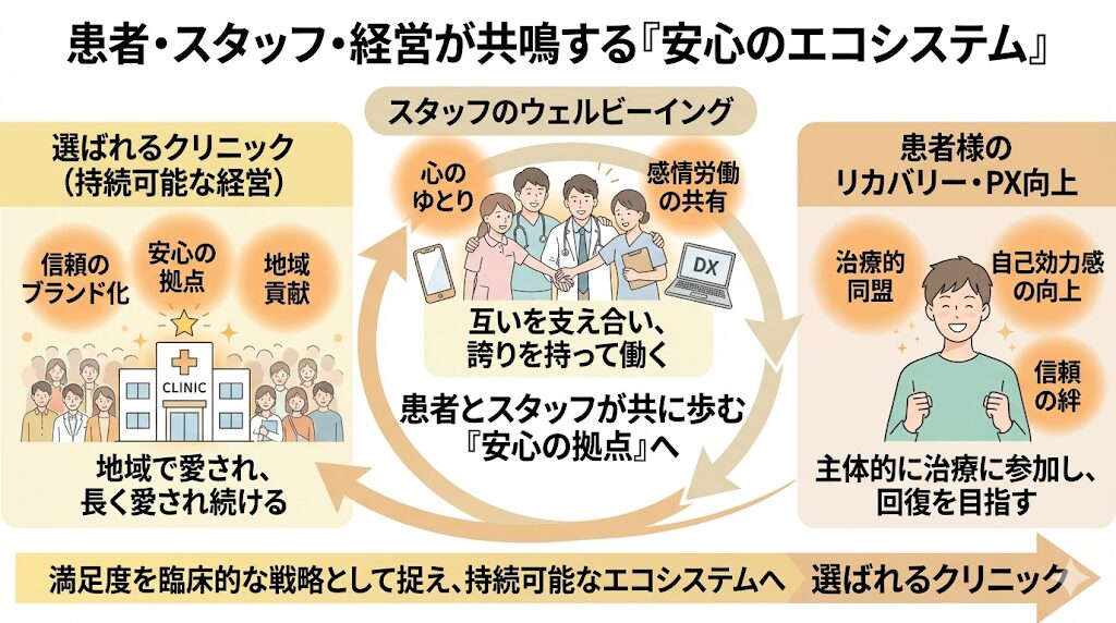この好循環の起点となるのが、第3章で触れたスタッフのウェルビーイングです。現場の「ゆとり」が、診察室での強固な「治療的同盟」を支えるエンジンとなり、患者様の心に「ここは自分の味方がいる場所だ」という深い納得感を残します。