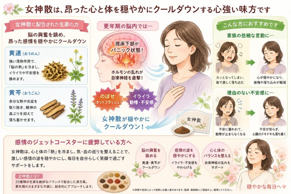 女神散に配合された黄連(おうれん)や黄芩(おうごん)は、脳の興奮を鎮め、昂った感情を穏やかにクールダウンさせる効果があります。