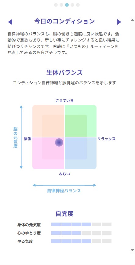測定後、利用者には状態に応じた具体的な行動提案が提示されます。たとえば「今日は集中力が下がっているので、午後は単純作業を優先しましょう」といった、即効性のあるアドバイスが届き、セルフケアを習慣化するサポートが行われます。