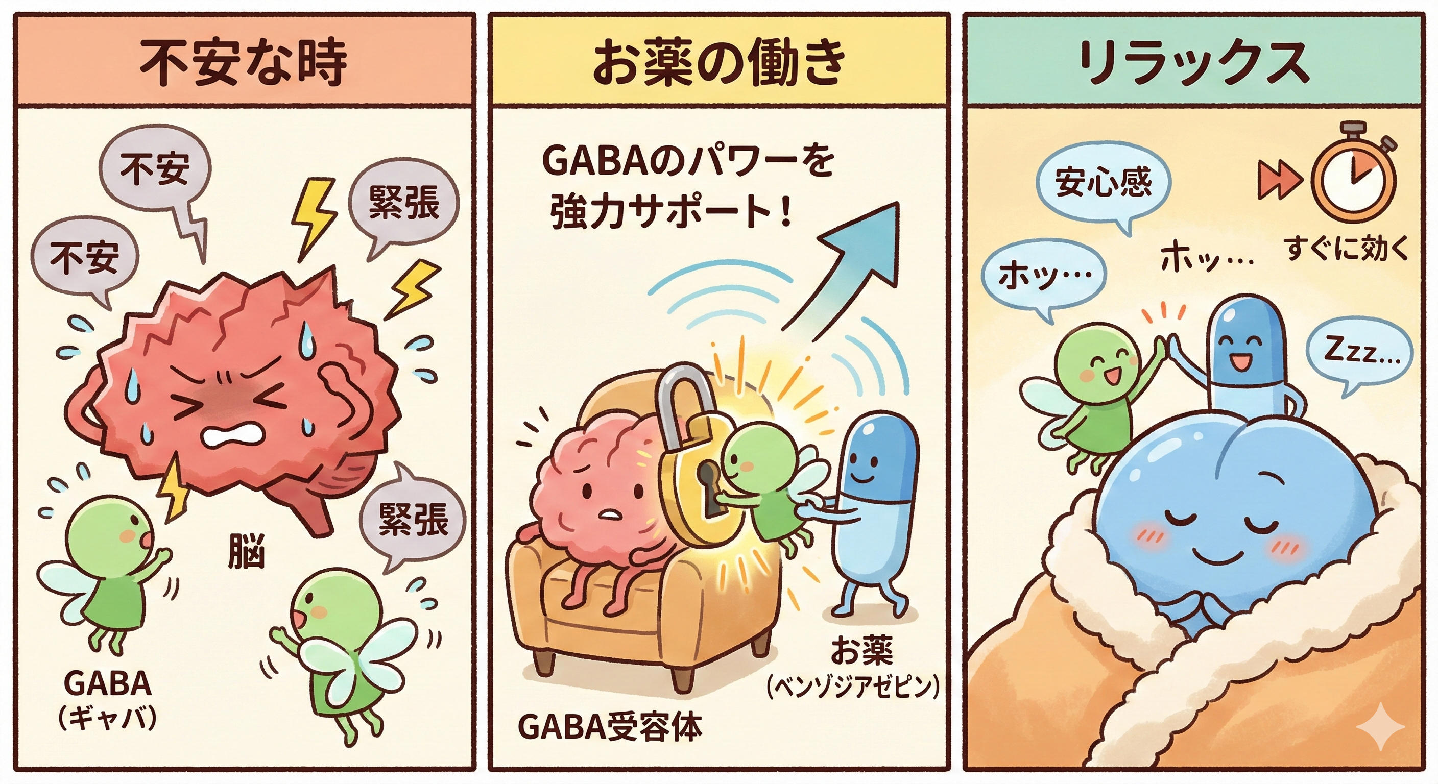 ベンゾジアゼピン系抗不安薬は、脳内の「GABA(ギャバ)」という神経伝達物質の働きを助けることで、不安や緊張をやわらげる効果があります。