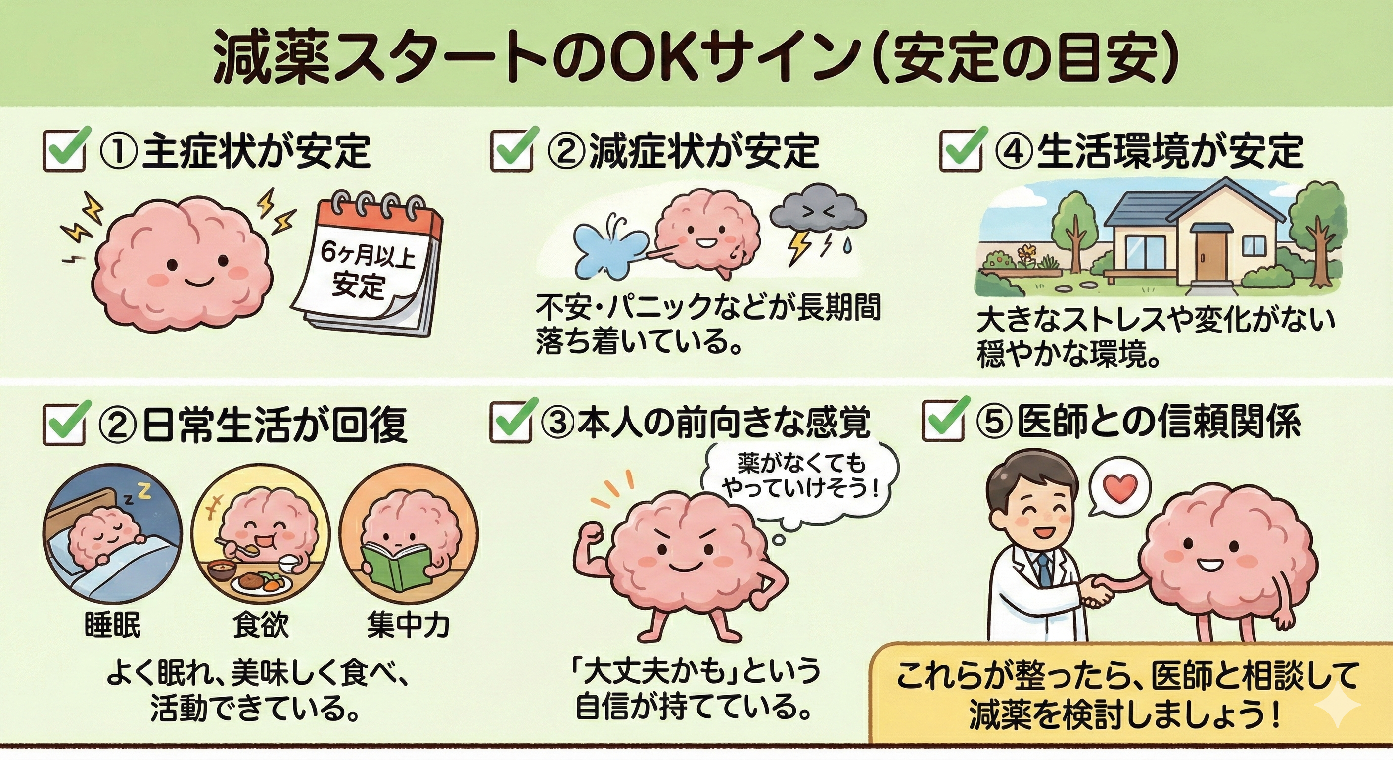 次の章では、精神科医が実際に行う「安全な減薬ステップ」や、減らし方の順番、期間の目安、生活の安定性をどう判断するのかなど、実践的なポイントを詳しく説明していきます。