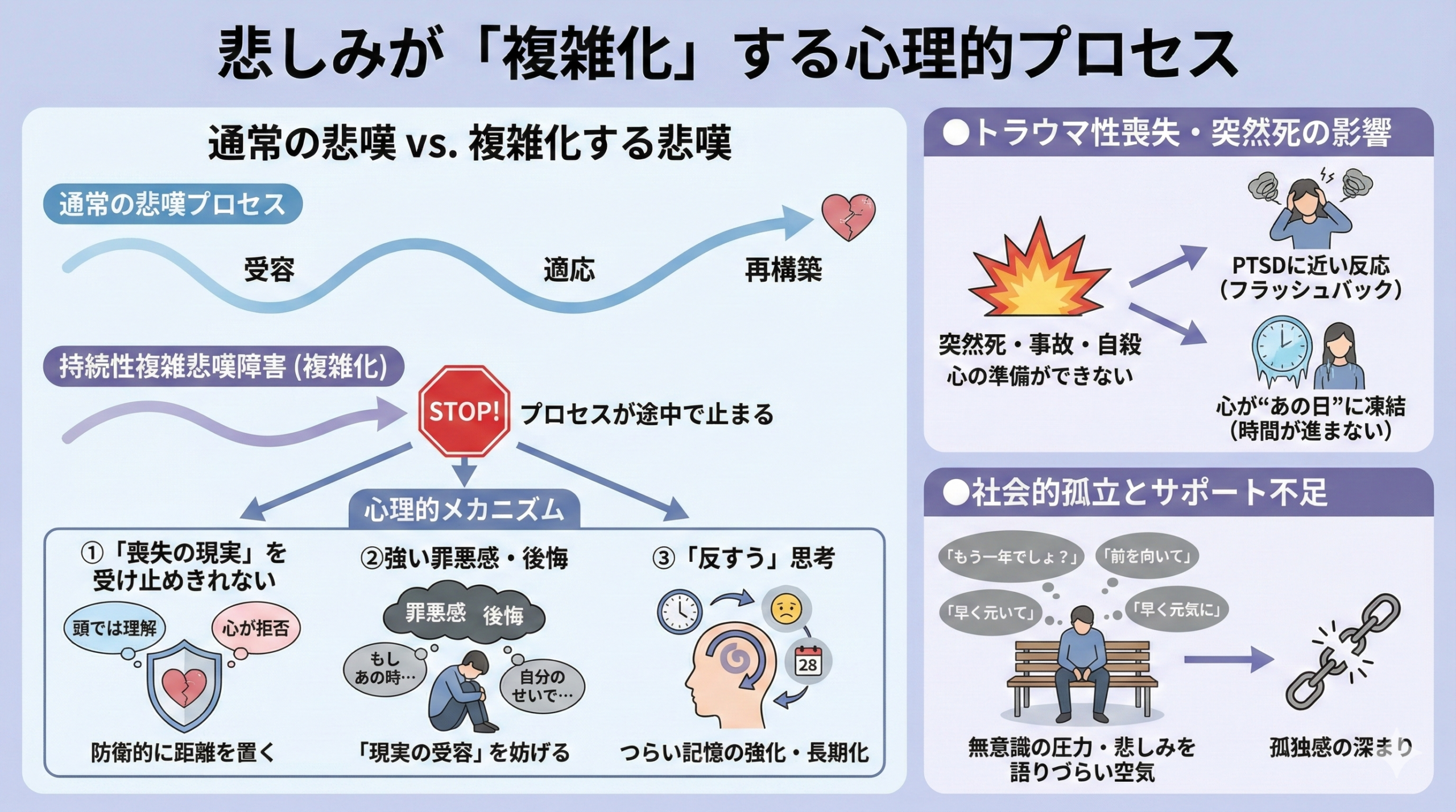 - うつ病やPTSDとは心理的プロセスが異なり、焦点が「亡くなった特定の人」に向かう点が特徴