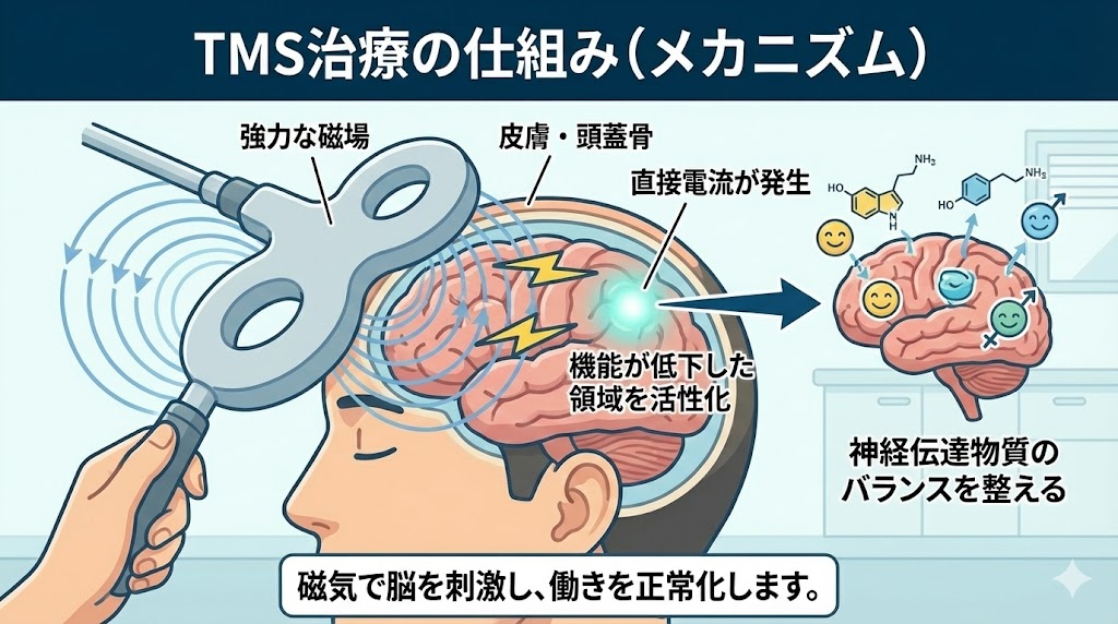 TMS治療とは、経頭蓋磁気刺激(Transcranial Magnetic Stimulation)の略称で、頭部に当てたコイルからの磁気刺激によって脳の特定部位を活性化させ、神経伝達物質のバランスを整えることでうつ病などの気分障害の改善を図る新しい治療法です。🆕