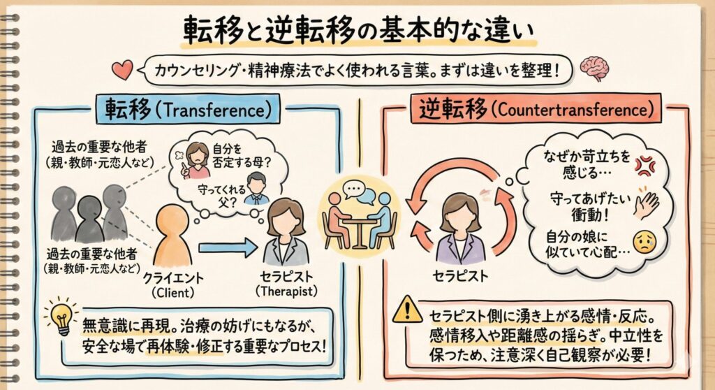 転移とは、クライエントが過去の重要な他者(親・教師・元恋人など)との感情や関係パターンを、セラピストに向けて無意識に再現してしまう現象を指します。