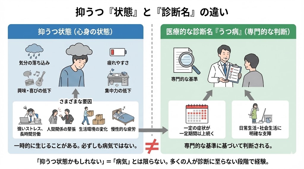 まず押さえておきたいのは、抑うつ状態と、医療的な診断名である「うつ病」は同一ではないという点です。