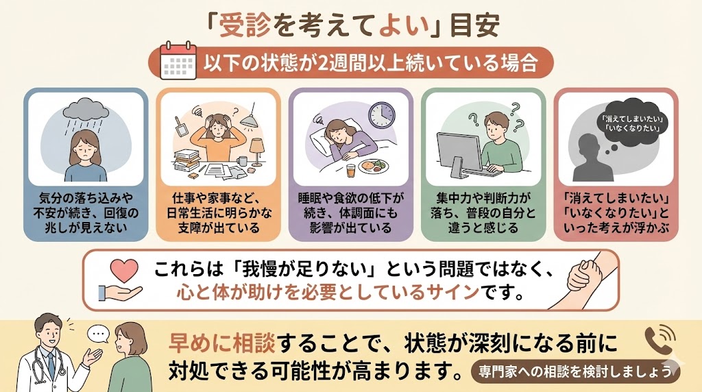 気分の落ち込みが続くと、「病院に行ったほうがいいのだろうか」「この程度で受診するのは大げさではないか」と迷う方は少なくありません。