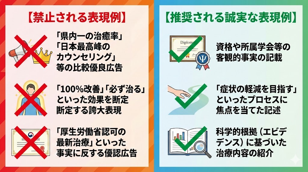治療効果はDSM-5-TR等の基準に基づいても個人差が極めて大きいため、主観的な「患者様の声」の掲載は原則として禁止されています。🆖