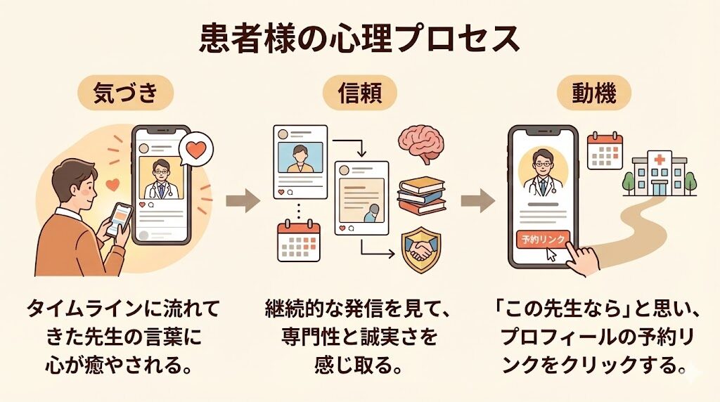 こうした違いから、日々の何気ないポストが、診察室のドアを開けるための「最後のひと押し」になるのです。🫷