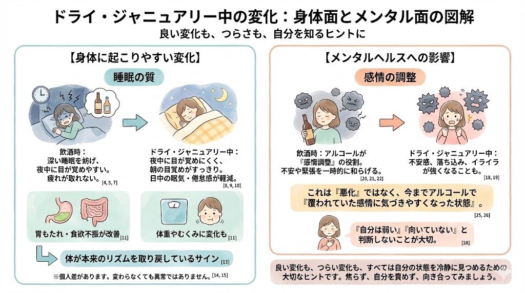 次の章では、アルコールが心身に与える影響を踏まえながら、ドライ・ジャニュアリー中に起こりやすい変化を、医学的・心理学的な視点から整理していきます。