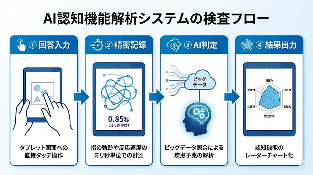 • デジタルアセスメント: AIが回答プロセスを可視化し、MCIの早期発見を支援する。