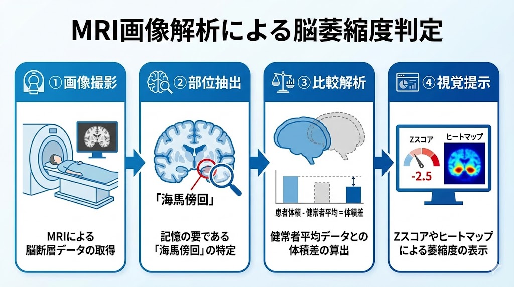 画像解析ソフトは、医師の目視だけでは判断が難しい脳の微細な変化を可視化し、診断をさらに深化させます。代表的なVSRADなどでは、MRI画像から「海馬傍回」の萎縮度を算出し、健常者データベースと統計的に比較することで、客観的な数値指標を提示します。🧠