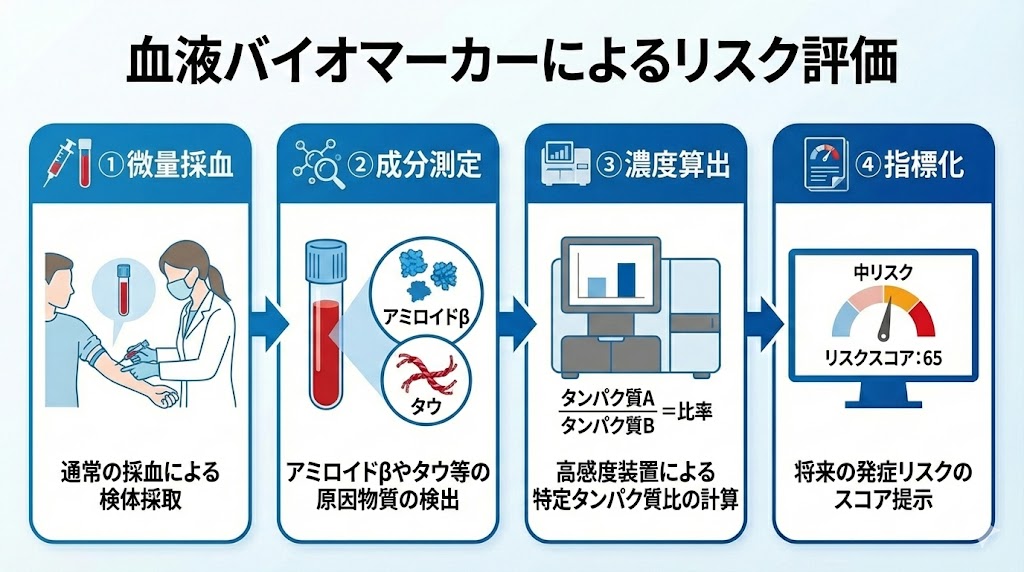 具体的には、脳内の異変を示唆するアミロイドβやタウなどの微量成分を検出し、将来の発症リスクを客観的なスコアとして算出します。