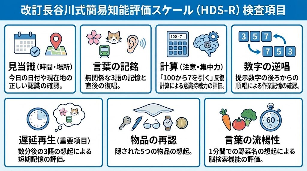 国内で普及している「改訂長谷川式簡易知能評価スケール(HDS-R)」は、日付の見当識や言葉の再認を通じ、主に記憶機能(記銘力)を短時間で評価する対話型検査です。