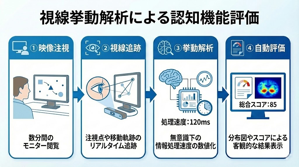 アイトラッキング技術は、モニターを見つめるだけで認知機能を評価できる画期的な手法です。特殊なセンサーが、「どこを何秒注視したか」という視線の軌跡や反応速度をリアルタイムで追跡し、無意識下の情報処理能力をスコア化します。👁️
