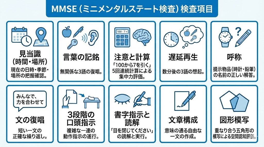 一方、世界標準の「MMSE」は、図形模写や指示遂行などを含み、言語や空間認知まで包括的に測定します。